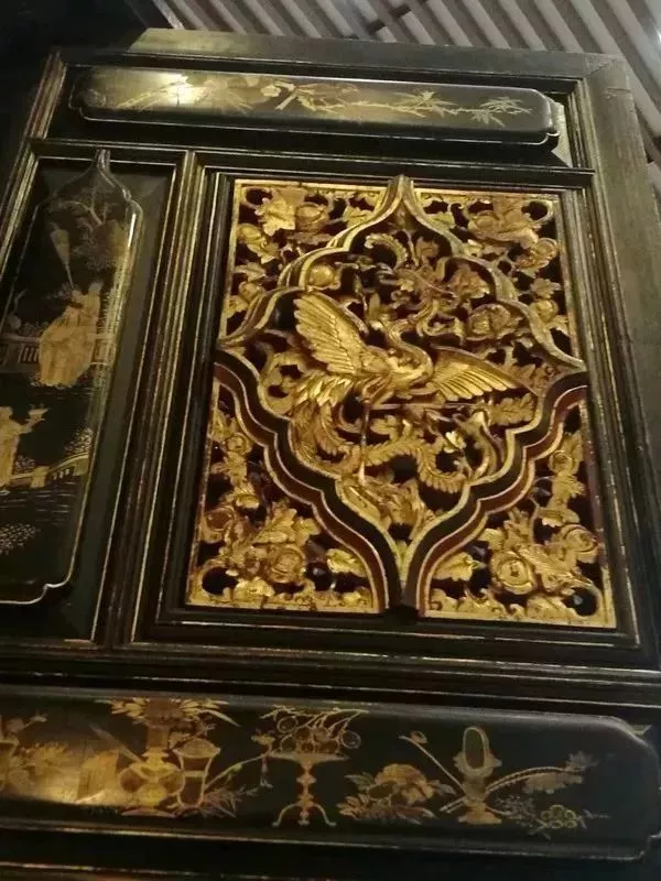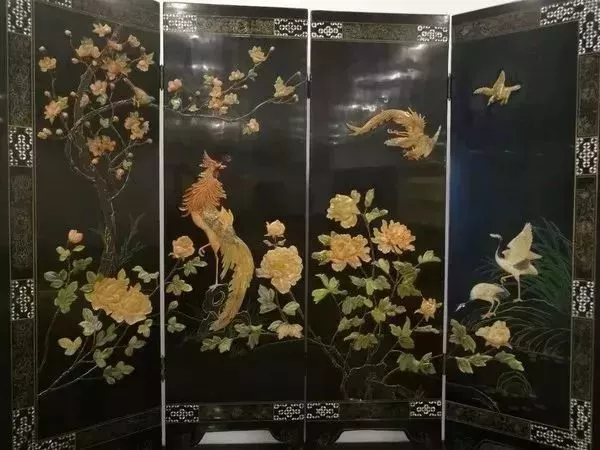 古拙的屏风上,花鸟已经失去了它原本明亮的色彩,但巧妙的雕刻使得它们的每根线条依旧那么灵动出彩。