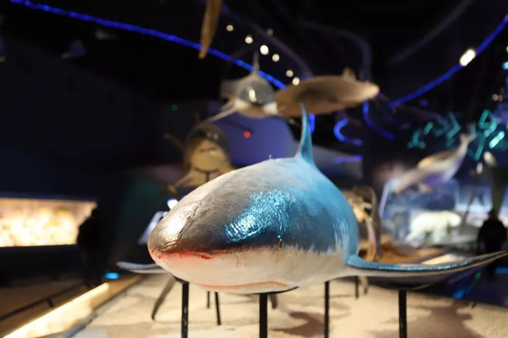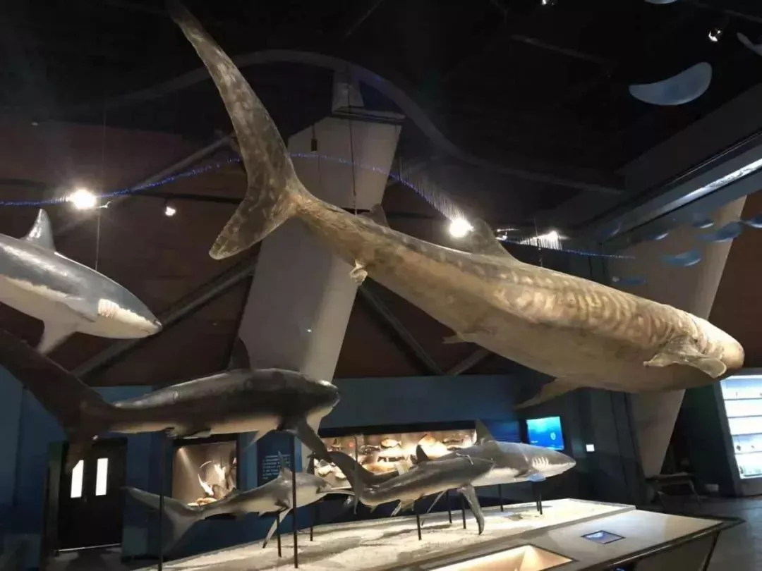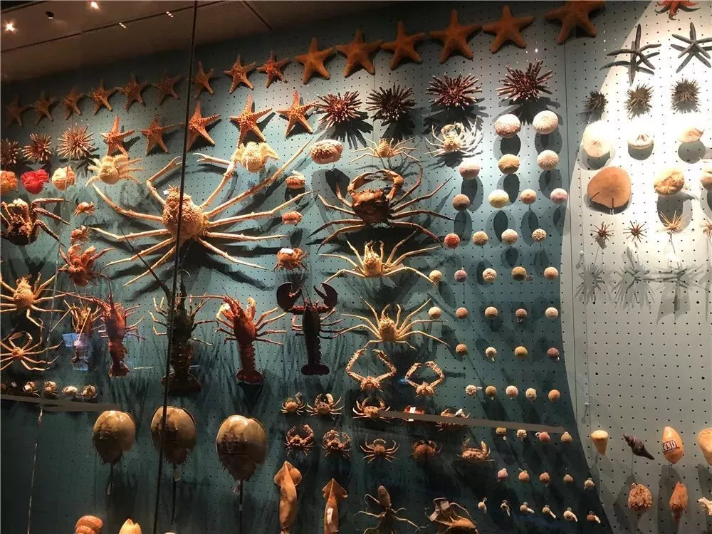 有长达9. 4米的鲸鲨,7-8米的白鲸等,极其罕见的怀孕双髻鲨塑化标本,海底滑翔机——蝠鲼、大王乌贼以及300余种五彩斑斓的鱼类,100多种海生鸟类,还有目前世界上最完整的一套中国海域无脊椎动物标本,其品类多达4600余种,展览面积超过30平方米。