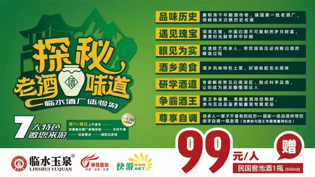 早上六安指定地点集合前往霍邱临水酒厂,在酒厂政务讲解员的带领下参观、探秘、深度体验,开展品酒比赛,解密常见白酒误区,开展“酒王争霸”,获奖人员在国家一级品酒师指导下亲自调酒(奖品)。