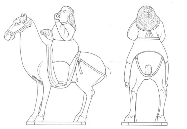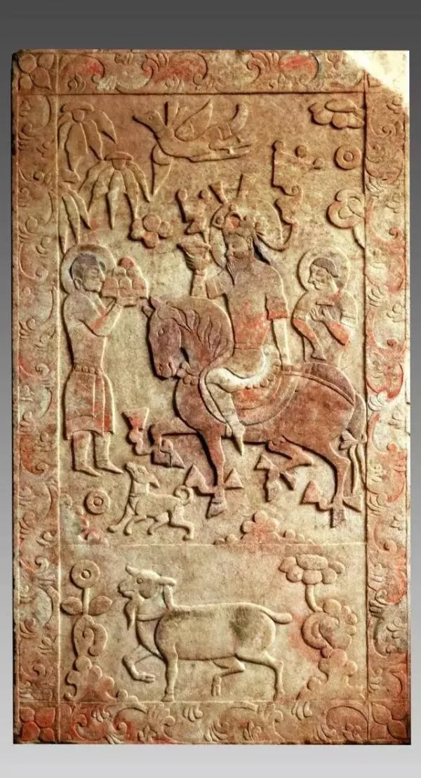 除粟特人外,并州还有许多柔然人、高车人与突厥人。柔然衰亡前后,许多柔然人与高车人迁徙到并州北部。在出土文物中,我们还能看到突厥(或柔然)人的形象,太原北齐贺拔昌墓出土的一件骑马陶质突厥人物俑最有特色,健壮的骏马背上,坐着一位游牧民族骑士,身体肥胖,头梳长发,十几条辫子留在背后,穿一件圆领窄袖宽肥红袍,脚踩马蹬。豪情满怀,一手牵着缰绳,一手举向嘴边打着口哨。类似突厥人形象,在西安北周史君墓、安伽墓、太原隋代虞弘墓出土石葬具雕刻图案中多次出现。