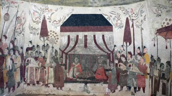 在平城遗址和晋阳城遗址及其周围,至今遗存着大量有关丝路或者西方文明的遗迹和遗物,最著名的当属云冈石窟,是佛教通过丝绸之路直通平城的最大物证,中西因素相互结合,气势恢宏,独一无二。在平城遗址内,还出土许多外来器物,如鎏金高脚酒杯、仿波斯银盘、琉璃碗、银质耳杯、镶宝石金戒指、波斯银币,外来造型的四狮环立石灯、各种中亚伎乐俑和牵骆驼的俑、丝绸之路东传乐器等,充分显示出丝绸之路与平城的重要关系。这些器物,件件都与丝绸之路有直接关系,如在大同市博物馆展出的四狮环立石灯,其狮子造型,在印度桑奇塔附属建筑中就有类似原形,刚出土,我们就议论,此物可作为平城的 logo(徽标)。另在新发现的北魏文成帝太安四年解兴石堂壁画中,居然发现箜篌演奏图,它的意义在于,这是北魏考古中发现最早的丝路器物东传的证据。根据以往的考古发现,结合云冈建造时间,前两年我们认为丝路文化被平城较广泛接受的时期当是文成帝时期,所举例证,都是文成帝和平年间的,现在看来,还可以提前到文成帝太安时期。环视黄河流域,在此时期,没有哪个城市遗址出土过如此丰富的外来器物。可以说,平城开创了丝绸之路的新时代,特点是,汉代的丝绸之路主要与官方发生关系,而平城以后的丝绸之路,不仅把中断多年的丝绸之路再度恢复,而且来往的深度、广度与长度上都百倍的超越了两汉,深入到民间和社会诸阶层,延续到唐五代之后。