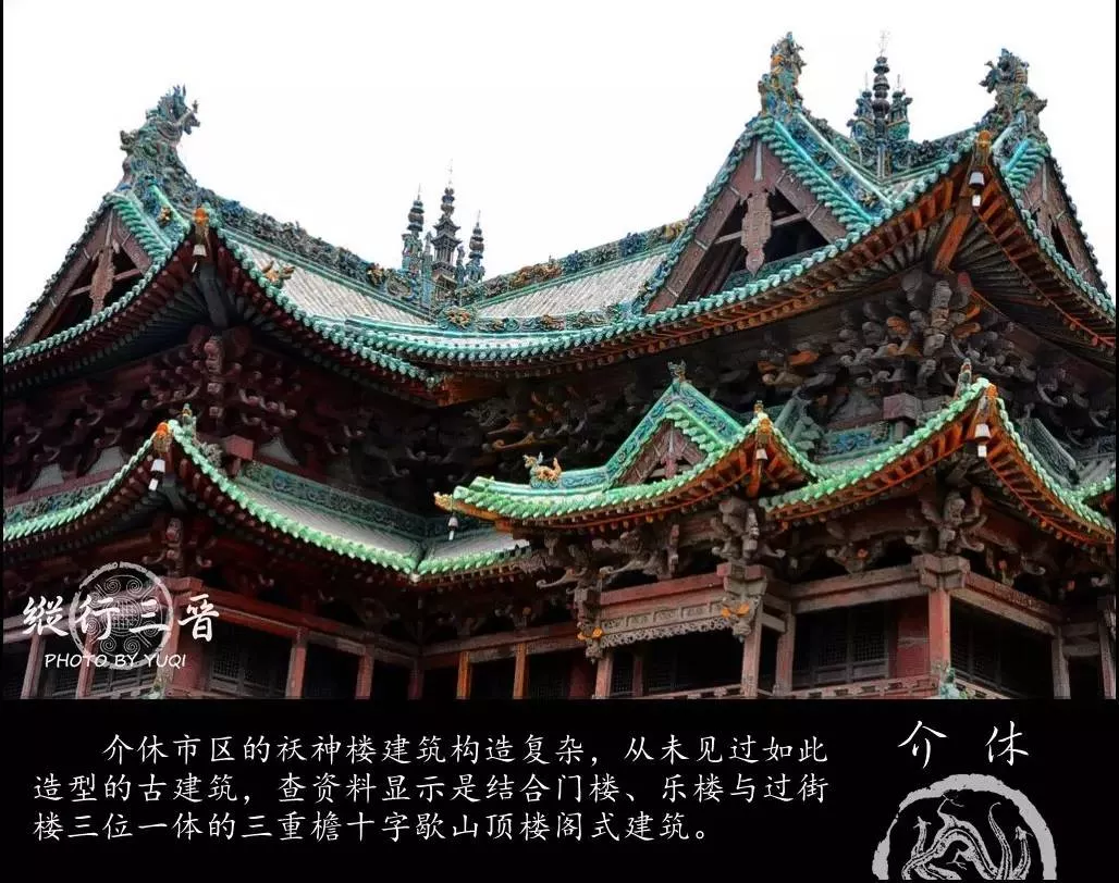 祆(xiān)神楼位于介休顺城关大街东端,是一个三重檐歇山顶转顶结构的古代建筑物,是中国乃至世界上上惟一保存的一处祆教建筑。祆神楼是原祆神庙的组成部分,楼因庙而得名,是一座门楼、乐楼与过街楼相接合的楼阁式建筑。祆神楼位居庙前,既是山门,又是点缀街心的过街楼。平面呈“凸”字形,凸出的部分为过街楼,高二层,中设平座,上施重檐。楼较宽的部分下层为山门,上层为乐楼。祆神楼的装饰中有许多传统庙宇建筑中根本看不到的图案,如猛虎、牧羊犬、神牛、大象等等,而这些恰恰是祆教的神兽。