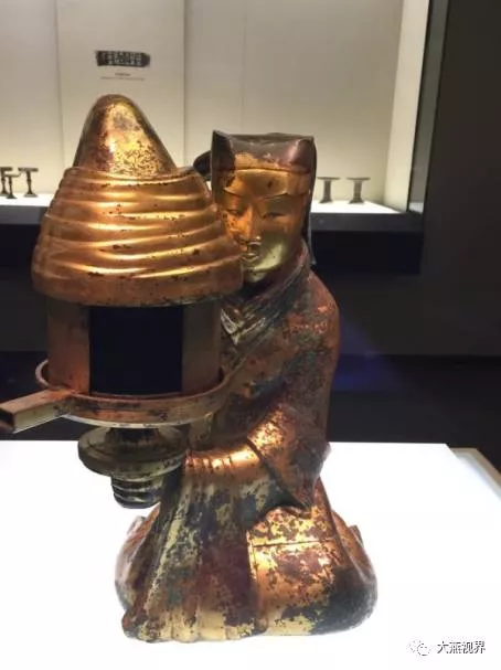 1、西汉“长信”宫灯 :1968年满城中山靖王刘胜妻窦绾墓出土。高48厘米,形状为跪地执灯的年轻宫女,通体鎏金。灯盘可转动,灯盘的屏板可推动开合,以调节灯光亮度和照射方向。宫女身体中空,烟灰经右臂进入体内,从而保持室内清洁。全灯分为头、身、右臂、灯座、灯盘、灯罩等部分,可以任意拆卸。灯上刻有“长信尚浴”、“阳信家”等铭文9处共65字。