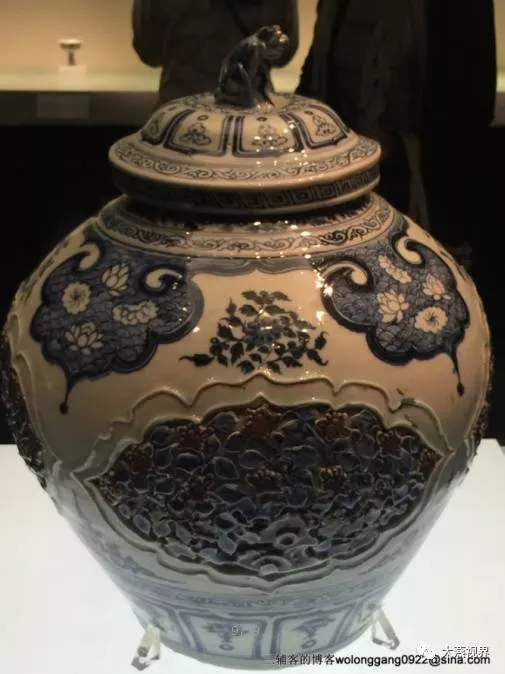 10、元代 青花开光镂雕红蓝釉花卉大罐1964年保定市永华南路小学元代窖藏出土。通高42.3厘米。罐体使用彩绘、镂雕、堆贴等多种装饰技法,共有11层纹饰。腹部作四组菱花形开光,开光内镂雕四季花卉和山石,枝叶用青花渲染,花朵和山石釉里红涂绘。青花色泽浓艳,釉里红颜色纯正,蓝红辉映,工艺高超,为元代青花瓷器代表作。