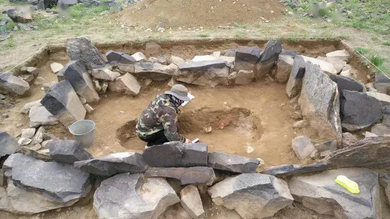 蒙古国的祭祀遗址多分部在石板墓的周围,外部形制多为圆形石堆、石围圈等。在这样的祭祀遗址中多随葬马和牲畜的骨骼及一些生活用品如陶器等。