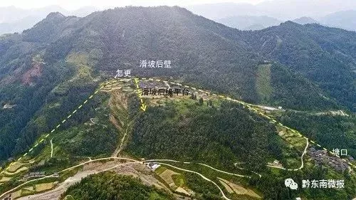 平寨-怎更-中寨一带是一条区域性北北东方向断层,断层破碎带内岩体破碎,地形陡峭,在持续强降雨影响下,坡体沿怎更后山向下急剧崩滑,主滑方向向东(约80度),形成的滑坡堆积体纵长约600米,前缘最大横宽达900米,保守按平均厚度6米估算,滑坡体方量至少200万立方米,实属罕见。