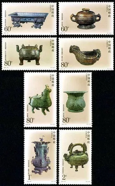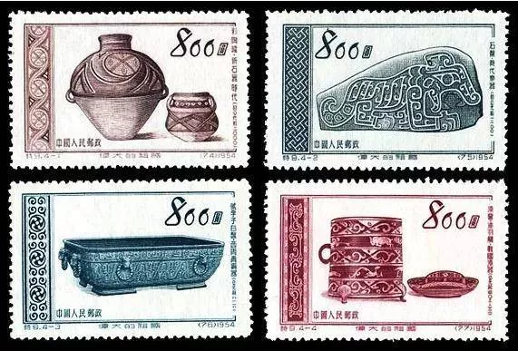 1954年8月25日,我国邮政发行第五组《伟大的祖国--古代文物》特种邮票(特9),全套四枚。四枚邮票分别展示了我国新石器时代的“彩陶罐”、商代的“石馨”、西周时期的“虢季子白盘”和战国时期的“漆奁、漆羽觞”。四枚邮票面值均为旧币800元。