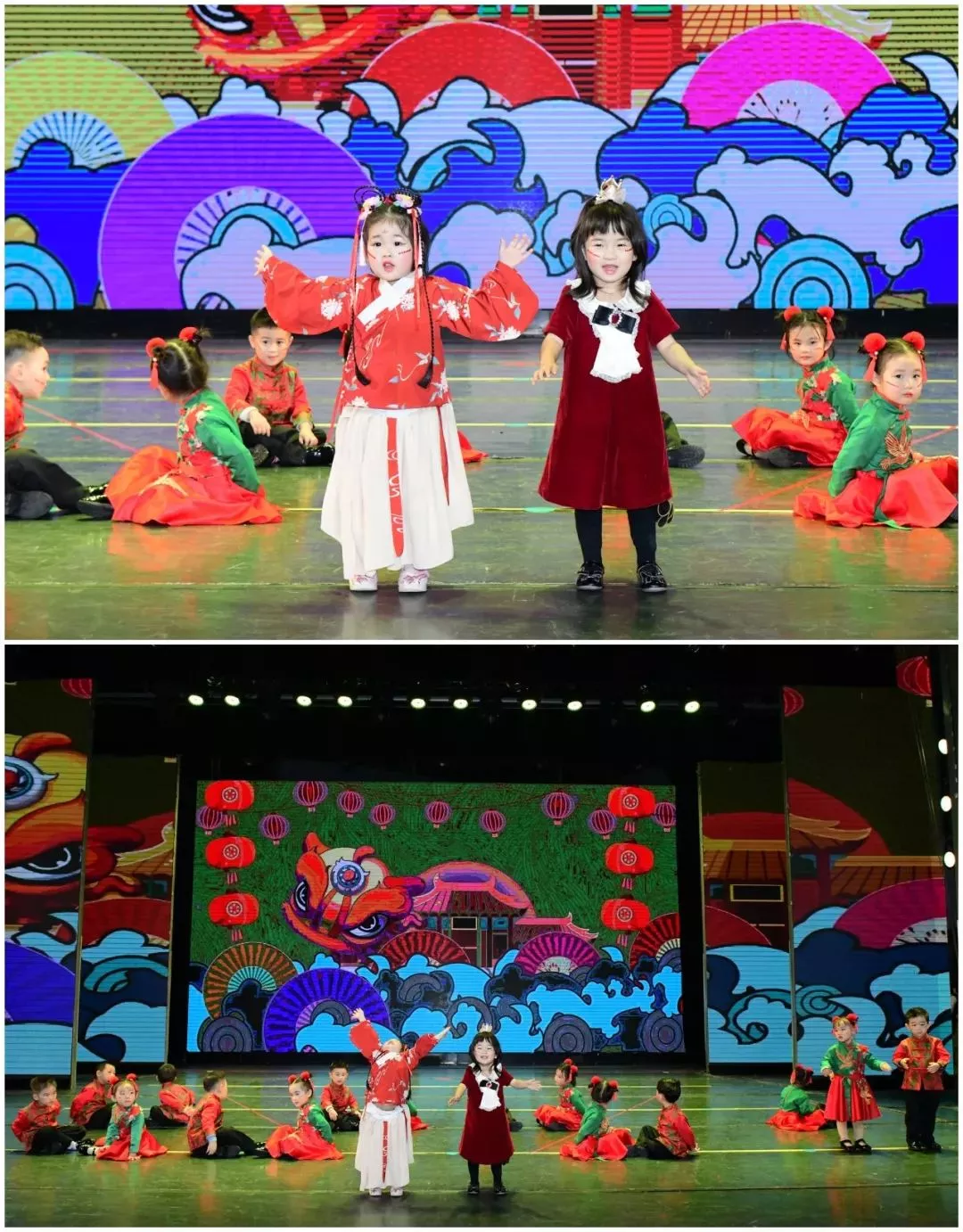 孩子们在舞台上展示自己活泼自信的一面,将每一个角色用自己的理解与方式呈现,台下爸爸妈妈举起手中的荧光棒给孩子们加油打气,后台中,小演员们开心搞怪,十分欢乐。