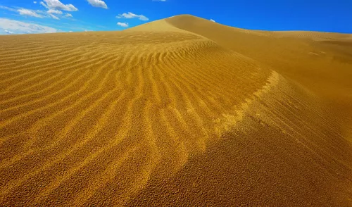 高格斯台夏天气候温润,凉爽宜人,登高眺望颇有几分“江南水乡”的风姿。远远望去碧水弯弯,在茫茫沙地和榆柳中时隐时现,葱郁的草木,连绵的沙丘,潺潺的流水,珍珠般散落的畜群,构成了这里独特的迷人风光。沉寂的沙山,静静地躺在蓝天下,反射着金色的光泽。沙链、沙丘、沙山线条多样而柔和,那些线条就像大海泛起的波浪,一层层推到天边。