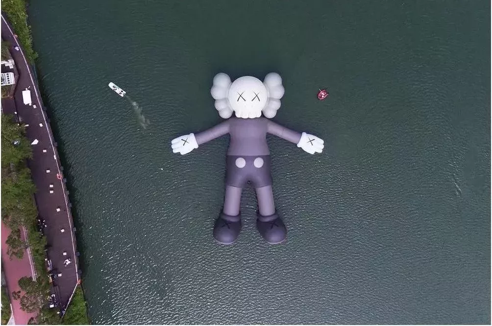 这次展出的人偶是艺术家KAWS的艺术作品,艺术品的名字就叫做「KAWS:HOLIDAY」。创作者 KAWS 这样解释这个雕塑:“我就是想做一个水上的雕塑。我想在现在,我们需要一些东西来帮助我们放松。于是,制作这个雕塑的时候我就想象是在度假的时候,你飘在泳池中,然后伸展自己的身体。这件雕塑就是这样开始的。”