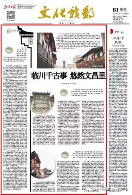 今日《江西日报》B1版《文化赣鄱》近一个整版刊发《临川千古事 悠然文昌里》,重磅推介被誉为“历史档案馆”和“老城博物馆”的文昌里。