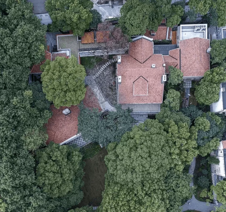 2017年,宝庆路3号保护修缮工程启动。结合现代化展陈展览功能需求,新增设轻巧通透的展廊连通原本散落的建筑单体,完善了展览参观的流线。新建连廊采用板柱结构体系,以实现轻巧通透的空间效果,同时位置尽可能向北面退让,以保留原院落空间和主楼建筑西立面别具特色的空间形象。新建连廊在面向花园景观方向采用大片玻璃窗,使用折板建筑屋面及墙面垂直绿化,将建筑体量消隐于景观绿化并融入原有的院落空间中。另外,连廊采用的耐候钢板也使新增部分具有自我身份识别性,并与原有建筑有机融合。