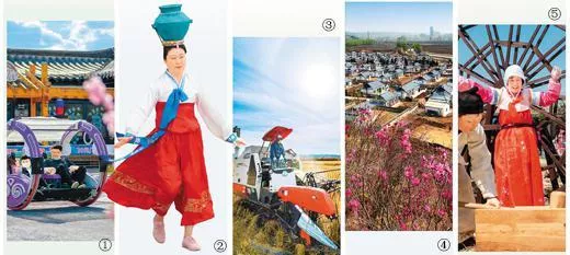图①:在延边州和龙市金达莱村,游客在体验游乐项目。
