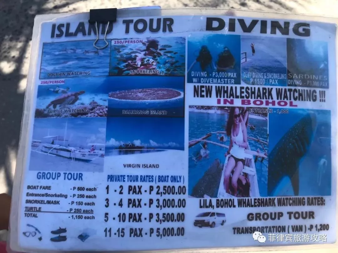 第二天将行程定在邦劳岛上,如果想出海潜水的话,需要在大早上6点左右赶到阿罗那海滩,海滩周边会有很多提供出海游的小旅行社,会给你推荐他们的出海套餐,套餐种类繁多,可以去巴里卡萨岛潜水,也可以追海豚、看海龟。