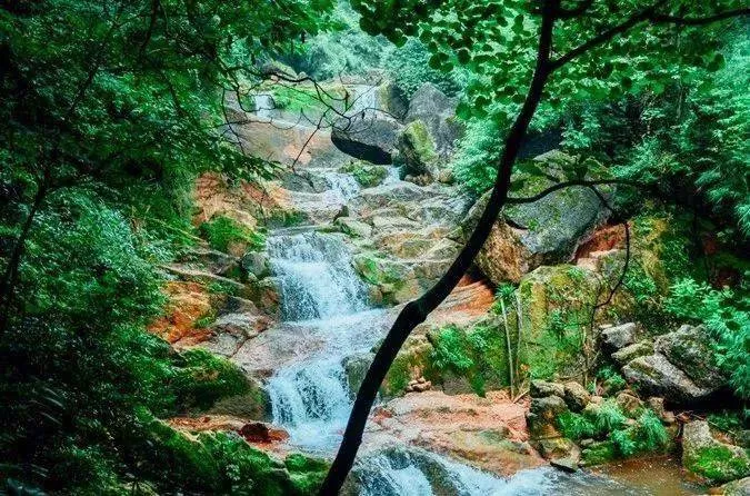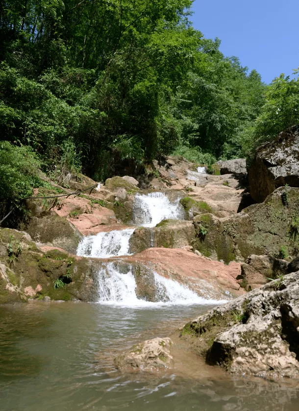 在群山掩映中,夬石河流经此处形成了 9级叠潭、落差约80米的瀑布群,同时还形成了两个偌大的水潭,更有野趣!
