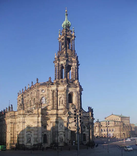 宫殿广场的西侧,坐落着德累斯顿最年轻的巴洛克风格建筑,圣三一大教堂(Kathedrale St. Trinitatis),也被称作天主教宫廷教堂。近4800平方米的占地面积,让它当之无愧的成为萨克森州最大的天主教教堂。