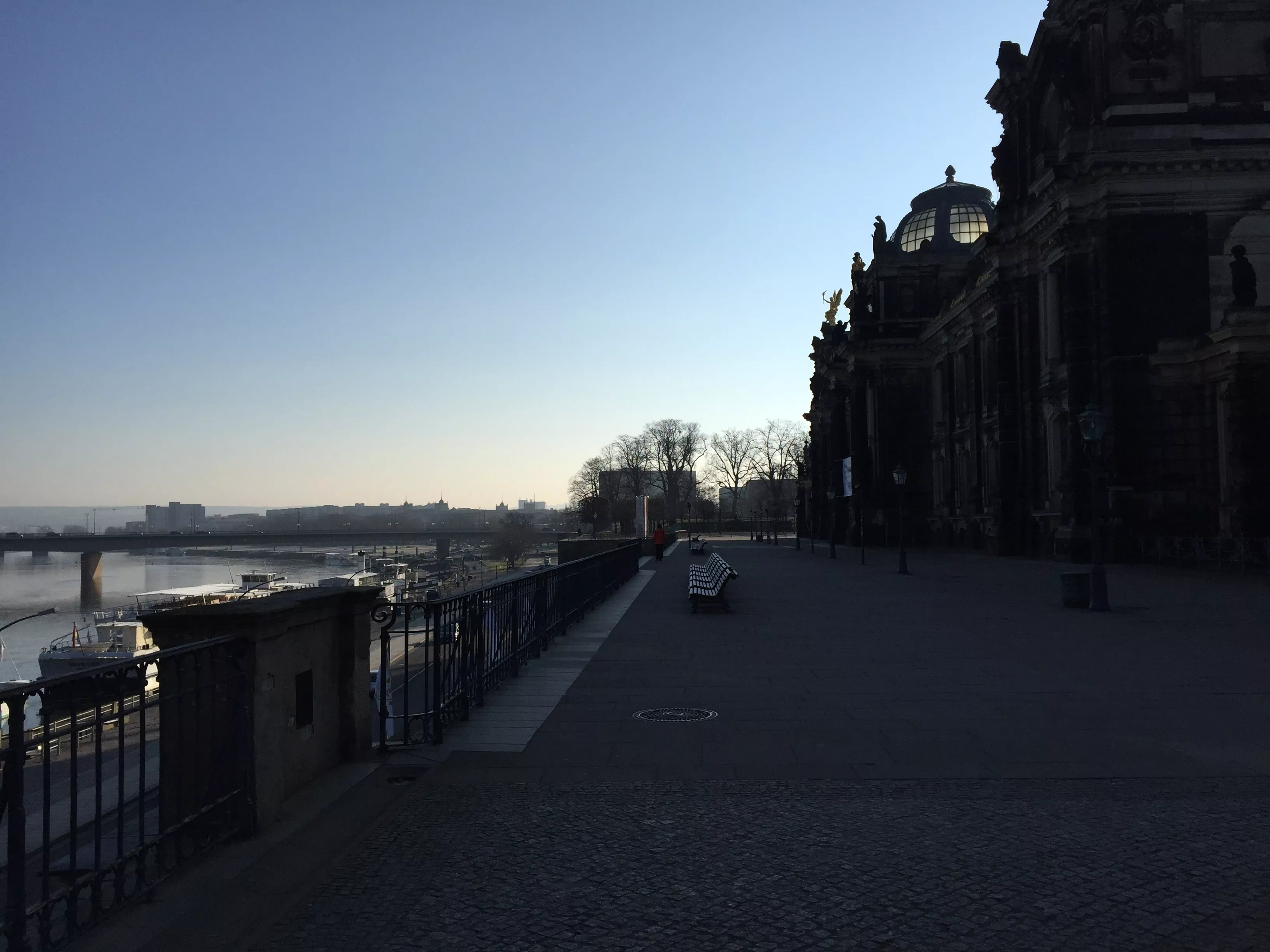 阿尔伯提努博物馆对面,拾阶而上是一片冬日里的绿色。布吕尔平台(BruhlscheTerrasse)由此而始。这座易北河南岸的露天平台,被歌德赞誉为“欧洲阳台”,是易北河岸漫步、眺望对岸的最佳所在。广袤河流隔开的新城和老城,北岸上,宫殿精致的尖顶、掩映的塔楼,壮丽的建筑、雄伟的穹顶,以及易北河中倒映的风光。南岸上,则是一排长长的古香古色的建筑:藏有大师作品的阿尔伯提努博物馆;拥有玻璃穹顶、外号“柠檬榨汁机(lemon squeezer)“的德累斯顿艺术学院;建筑立面左右分别刻着Pheidias, Iktinos, Praxiteles, Polykleitos, Lysippos和Erwin von Steinbach, Leonardo da Vinci, Michelangelo, Raphael and Dürer的国家美术学院(Staatliche Akademie der BildendenKuenste);以及萨克森的最高法院。
