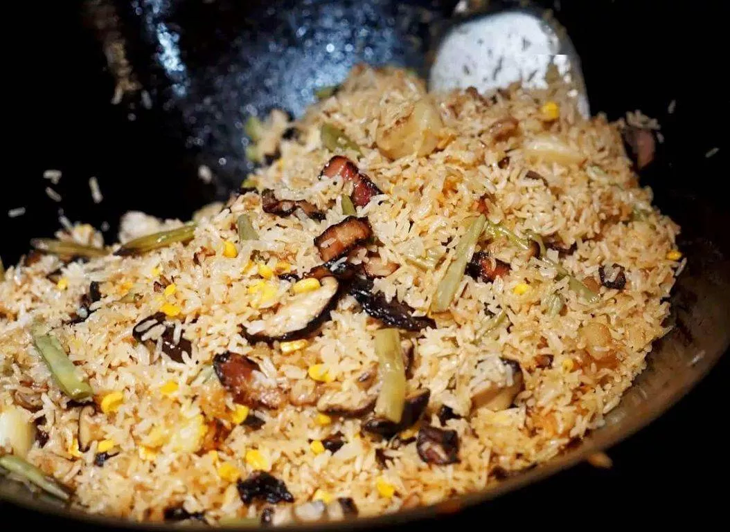 ↑ 咸酸饭是仙居人最爱的炒饭,最好吃的莫过于锅底的那一层锅巴,需要用农家土灶的锅气和火候才能做出的。
