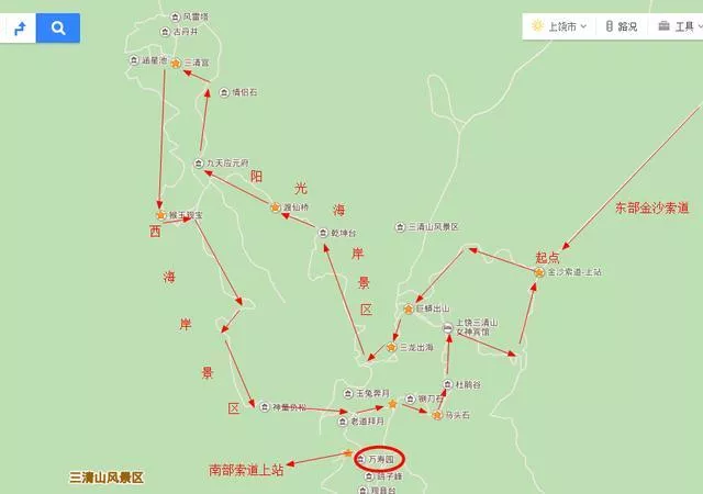 把小圈的景点放大,我们看看在山上要怎么走,起点定为东部金沙索道上站,一日游的话就我画的路线,逆时针走,为先苦后甜路线,当然也可以顺时针走,你喜欢。西海岸景区和阳光海岸景区分别是看日出和看日落的,不要错过这两个景点哦。
