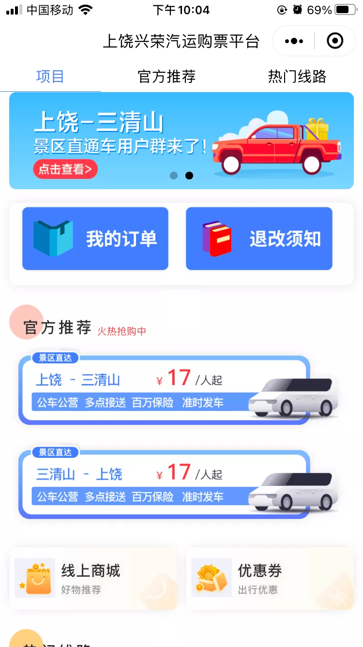本市游客:从上饶市(6:30出发)或玉山县(7:15出发)拼团拼车(根据人数确定车型,面包车、中巴车、大巴都可)出发到三清山南部索道。参加散客班一定要在上饶市早6:30、玉山县早7:15时间点等车。