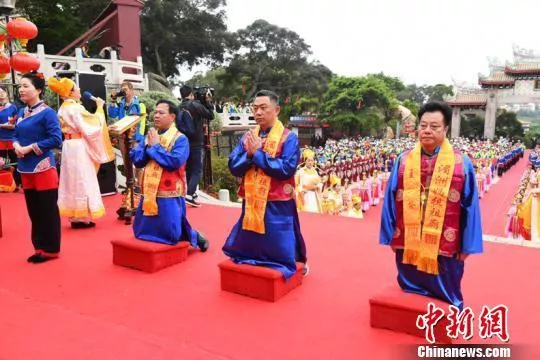 当天,盛大隆重的“妈祖祭典”活动在湄洲妈祖祖庙圣旨门广场上演。金门县县长杨镇浯,金门县知名人士洪允典,湄洲妈祖祖庙董事长林金赞,携金门当地26家宫庙及各界人士上千余人同祀圣典。