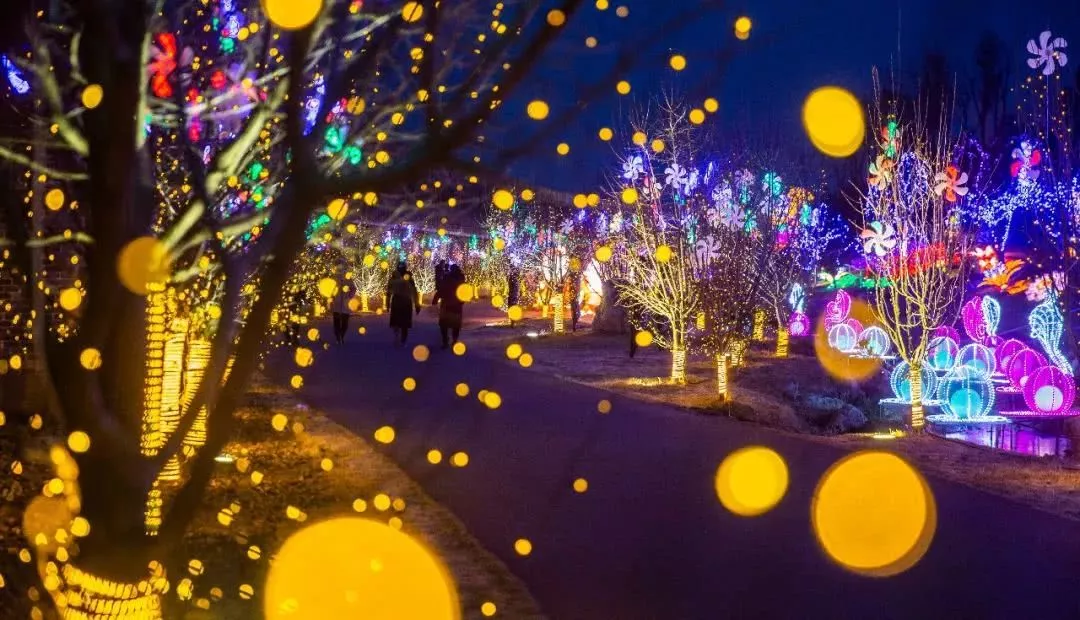 顺着指引来到海棠大道,两侧的树木上缠绕着各式各样的小花灯,远远的看上去如同漫天的繁星,走上路上,宛若遨游太空。路边的《律动》灯组别致有趣,成排的地灯非常魔幻,每踩一下等就会变换一种颜色,配上树上挂满的小灯,好像美丽的童话世界在开音乐晚会,而游客就像在指挥跳跃的音符。