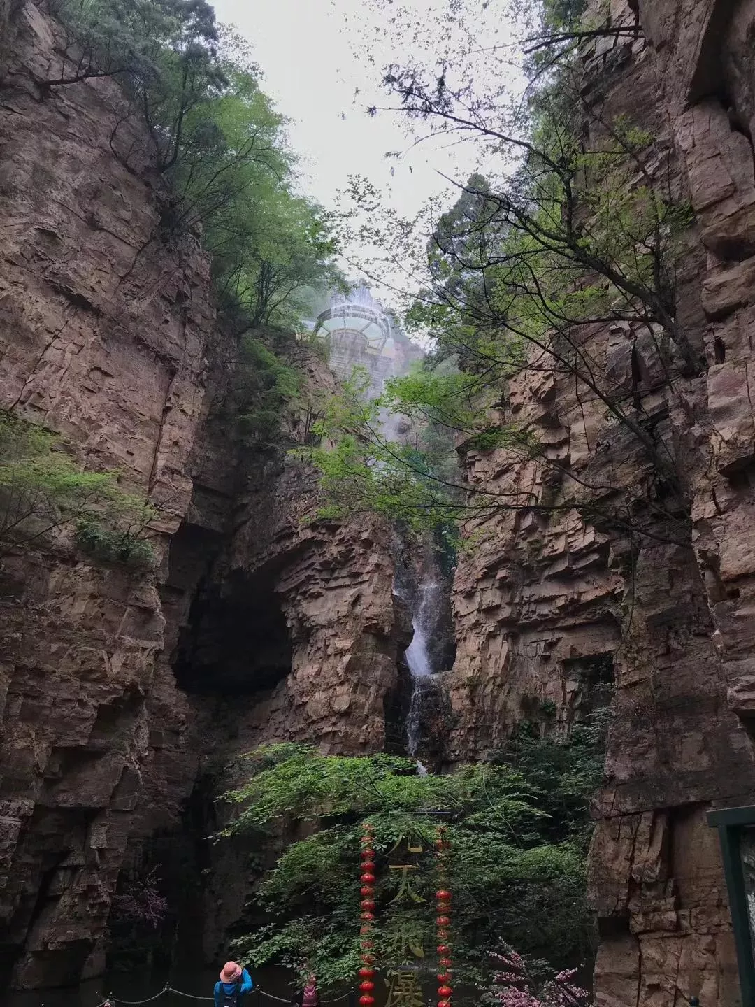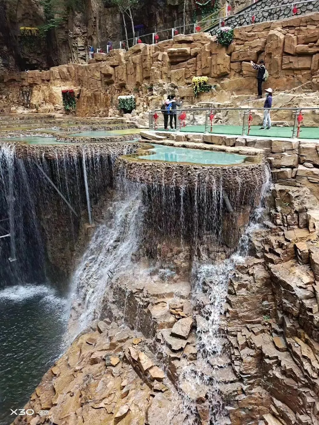 进入景区走上不十几分钟,空气变得越来越清爽,峡谷的幽深将燥热的空气隔绝开来。在峡谷尽头,有一条狭长的通道可以通往顶峰,石林峡景区的两个特色景点,七彩池和飞碟玻璃观景台都位于山顶。七彩池由大小不一的水池组成,瀑布倾泻而下,注入七彩池,在阳光下映出多彩的光辉。
