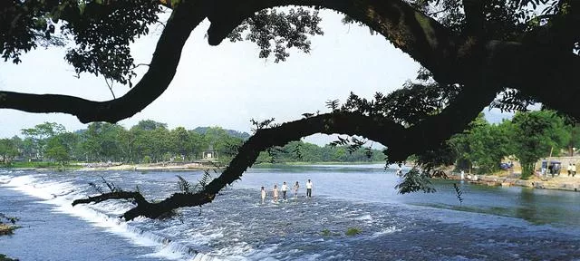 船工吱吱呀呀地用篙撑着船向前走,每经过一个地方,导游对这里曾经发生的故事娓娓道来——看到那座水上石桥了吗?那可是已经有将近两千年的历史了。汉代伏波将军马援当年征战至此,要过这里原来的老桥,无奈坐骑扬啼嘶喊,不肯过桥。将军下马一看,发现原来桥已经崩塌,于是将自己的爱马送到集市卖掉,建起了这座桥……