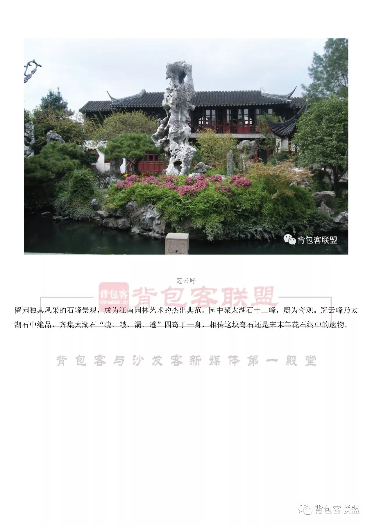 留园在苏州阊门外留园路338号,是中国四大名园之一。始建于明代万历二十一年(公元1593年),为太僕寺少卿徐泰时的私家园林,时人称东园,其时东园“宏丽轩举,前楼后厅,皆可醉客”。瑞云峰“妍巧甲于江南”,由叠山大师周时臣所堆之石屏,玲珑峭削“如一幅山水横披画”。今中部池、池西假山下部的黄石叠石,似为当年遗物。