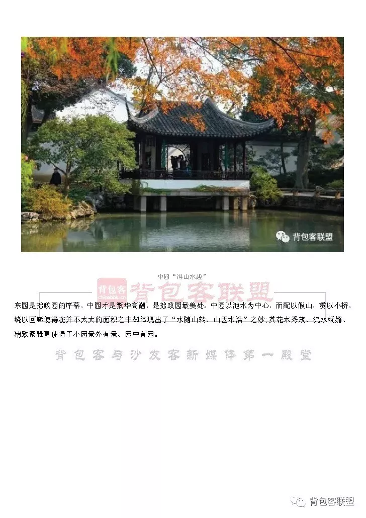拙政园,以水见长、自然典雅、庭院错落、花木为胜。始建于明代,与留园、北京颐和园、承德避暑山庄并称为中国四大名园。拙政园里处处是精雕细琢,粉墙黛瓦,小桥流水,绿树红花,蕉肥竹瘦。 此园分东、中、西三部分,各有风味。东园面积最广,绿野遍布、莲渠萦绕,树古林深。东园与中园,以极为别致的游廊为屏风,连接彼此。立于廊下,才能细细感受古树参天、小桥流水的意趣。