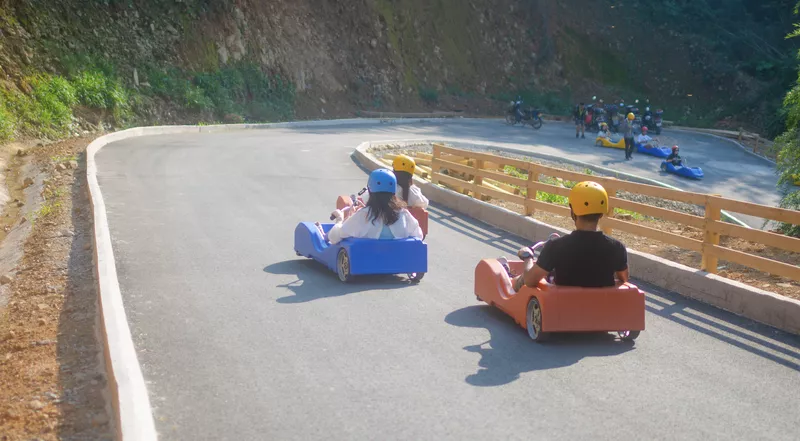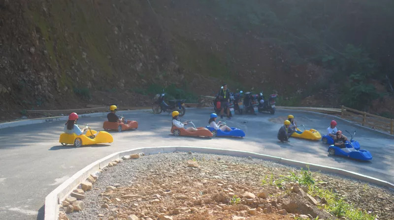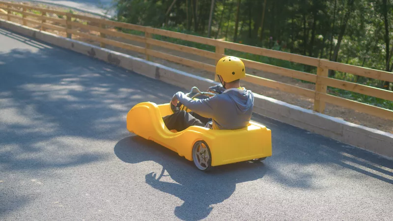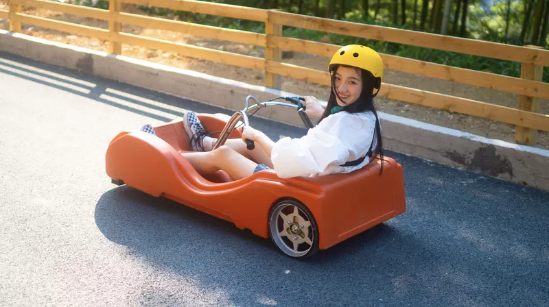 坐在滑板小车上,实现高速行驶,体验速度与激情和山峰的呼啸~当然啦,害怕的朋友们可以轻捏手刹降低速度哦!