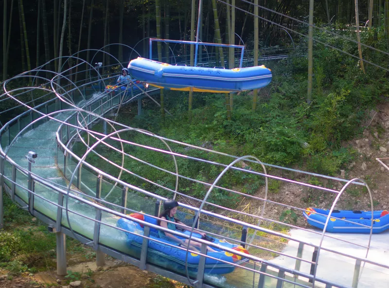 1000m左右的玻璃漂流滑道围绕在竹海里,坐上橡胶艇一冲而下,跌宕起伏穿梭竹海,仿佛身处绿野仙踪,大自然真美好啊!