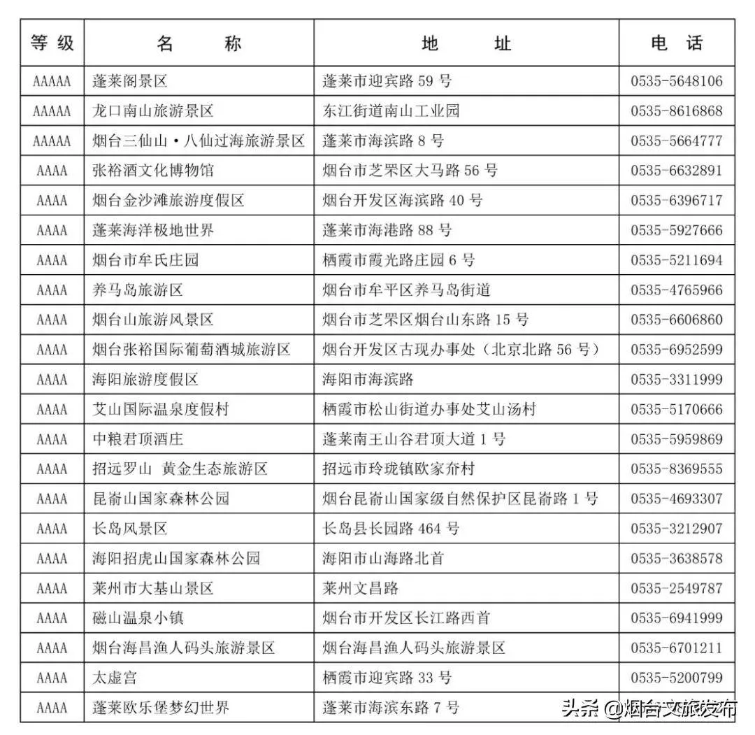 烟台所有4A级以上景区名录