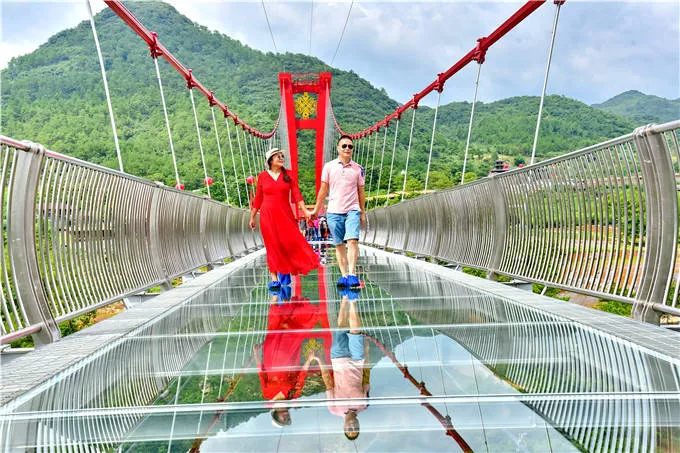 这样一座巨无霸的擎天之柱玻璃桥是否安全?一个惊心动魄的挑战在现场举行。据技术人员介绍,玻璃桥施工采用全预制进口螺栓连接,既保证了项目的安全性,结构的稳定性,又提升了观赏的刺激感。整座玻璃桥通体采用全球最厚的3层4.5厘米厚度的进口超白夹胶玻璃,这种超白玻璃的透光率为99.15%,其水晶般的光泽、高清晰的亮度、超高的光折射率,会让游客的视野更加明亮。桥梁两侧采用竖向圆弧形不锈钢护栏,让游客在玻璃桥上360°览景拍摄的同时,最大程度保障安全。