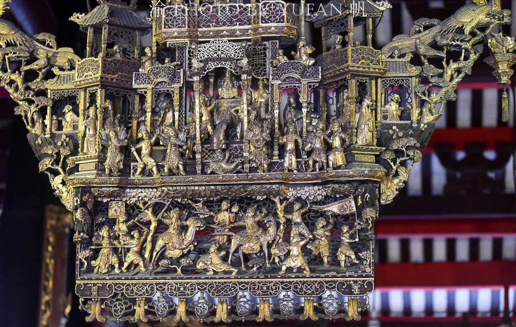 精美的瓦脊太长,拍出来看不到细节,我们用长焦拉近来看看,几十米上的瓦脊上全是如此精美的人物故事情节,而且没有重复的,每一个人物都不一样,有的是陶塑,有的是灰塑,陶塑很好理解,是烧出来的,灰塑又叫灰批,同样是佛山具有悠久历史的民间艺术之一,灰塑主要用在门额窗框、山墙顶端、屋檐瓦脊、亭台牌坊等处。其题材有人物、动物、山水、花鸟以及书画等。在祖庙中,这种禅城传统的民间灰塑艺术作品比比皆是。如祖庙两旁门、额的灰塑:“唐明皇游月宫”、“桃园结义”,东廊的“郭子仪视寿”,西廊的“哪咤闹海”等。此外,还有:“八仙”,“三英战吕布”、“刘伶醉酒”以及琴棋诗画等题材的作品。