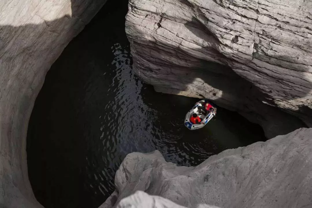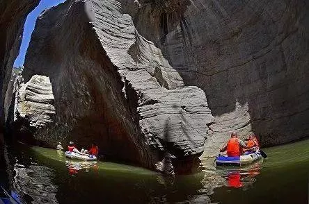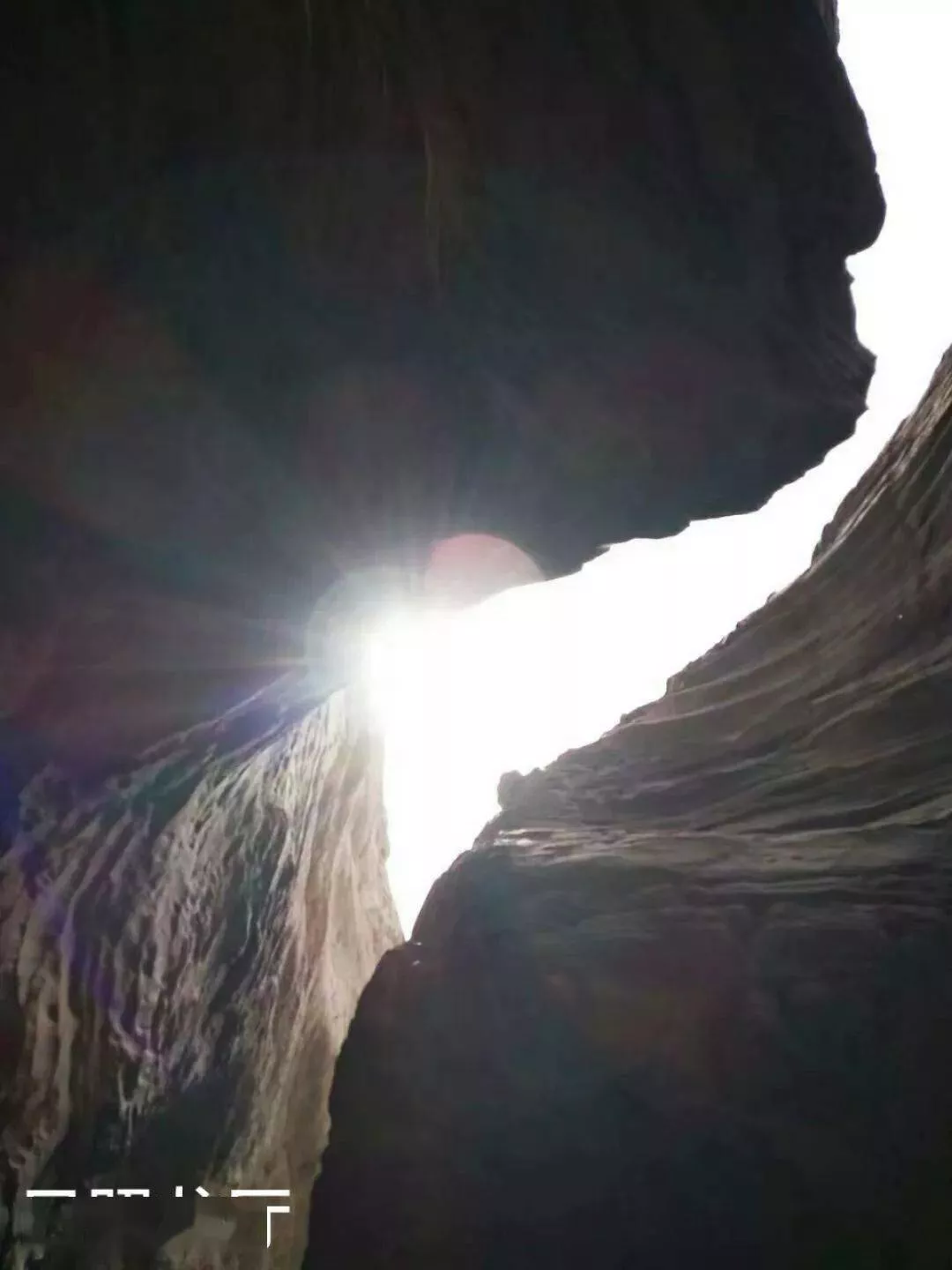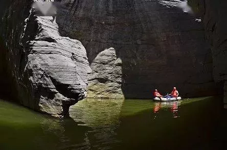从龙潭往里游,水越来越深,到了小侧傍、大侧傍一带,更是深不见底。再往里游,两岸石壁对峙直立,仅有一米多宽的水面,只能容游人一个个纵列而过。有的地方,两岸顶部岩石几乎贴在一起,寂寥森然,人曰“不见天”。游过“不见天”,豁然开朗。