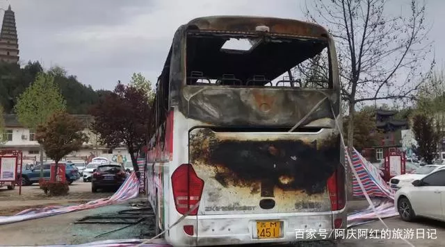 在普救寺停车场看见一个被烧成这样的公交车。行车一定要安全。