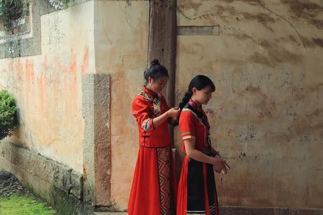 两个土家族的姑娘,一个在帮另外一个缠绕马尾。这里的姑娘大部分的都是土家族的,淳朴美丽,歌喉更是动人。