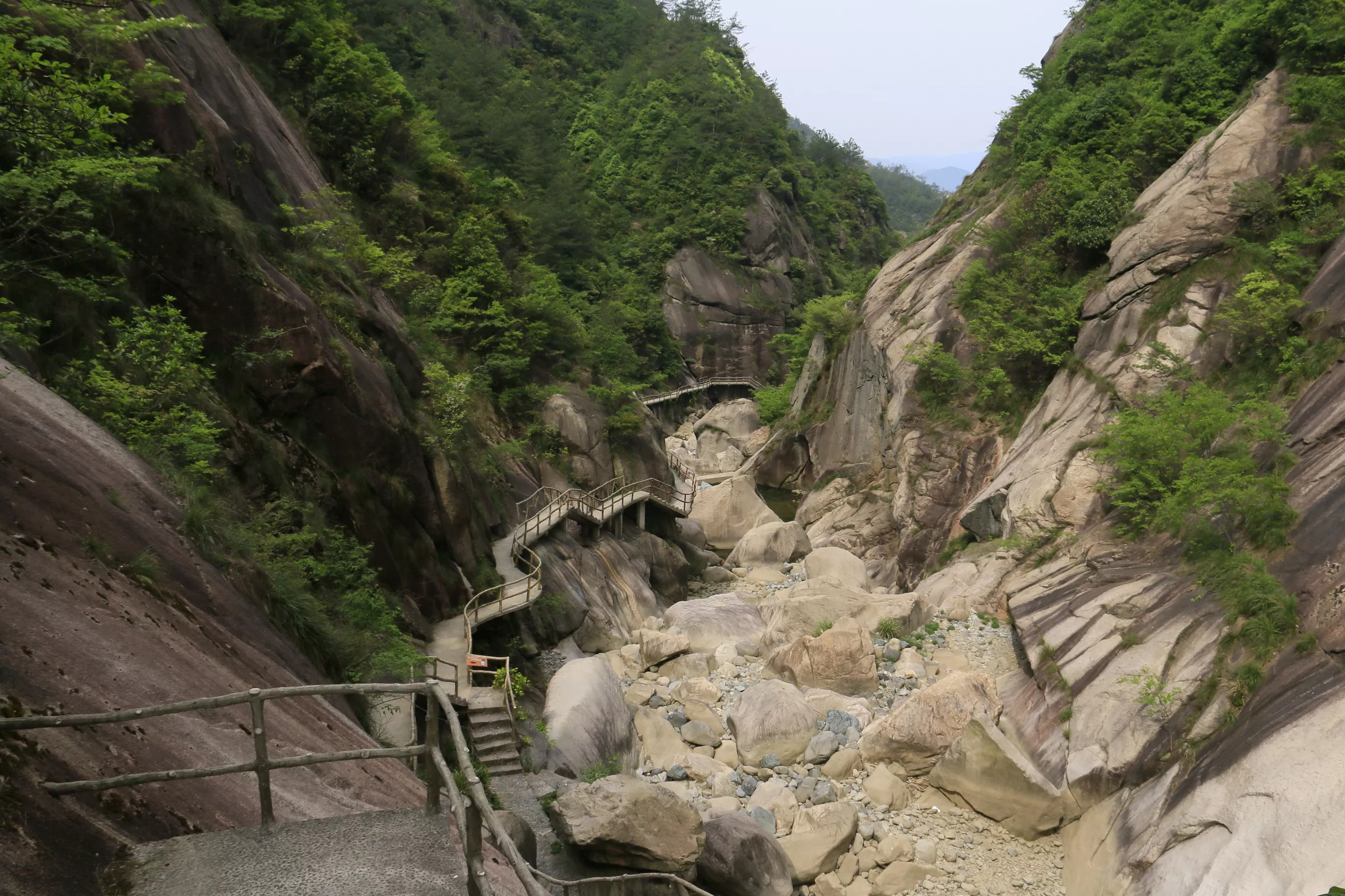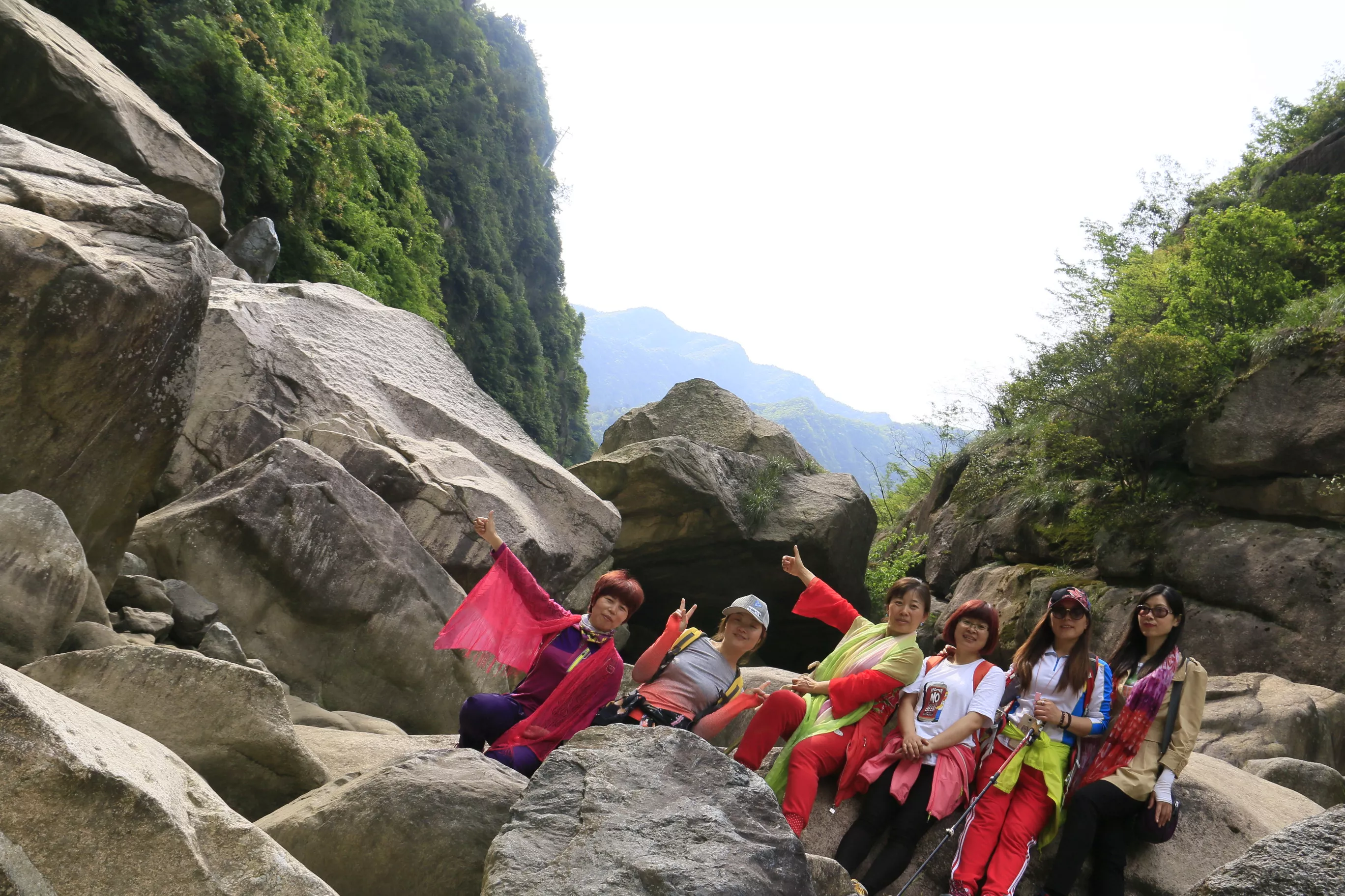 每次出游,运气都格外地好,天气预报说了有小雨的,结果却没有下,让我们的徽杭古道游分外顺利。沿着道逍遥河前进,一侧是掩映于竹林深处白墙灰瓦的徽派别墅群,一侧是农田,渐行渐深,山坡慢慢高耸成陡峭的山峰,夹出一条幽深的大峡谷。这就是逍遥谷,徽杭古道江南第一关就在这个大峡谷中。
