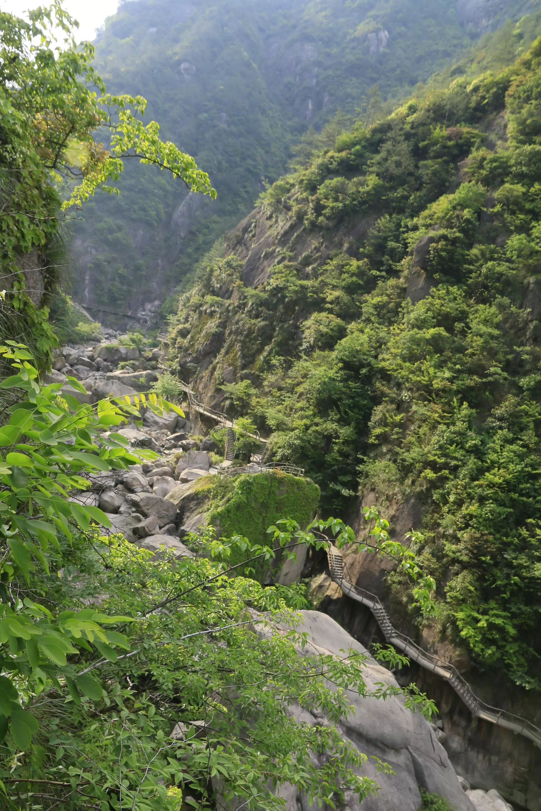 古道开凿在左侧峭壁上,右侧就是万丈悬崖,茂密的灌木掩映着,沿着盘旋于陡壁间的古道蜿蜒而行,倒也没觉得有多惊心,悬崖下就是逍遥谷,而对面的秀峰、怪石和前行途中的飞流瀑布让这条商贾古道多了更多的仙气。欣赏着峻秀绮丽的山水风光,远观将军石、顺帆石、佛掌岩之雄奇嵯峨,瀑布、溪水之潆回跌宕、涓细飘逸,江南第一关之古朴旷远,逍遥山谷之深邃隐秘。
