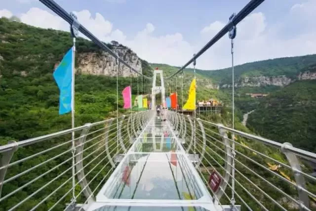 山东首个挂壁玻璃栈道---玻璃栈道是山东首个挂壁玻璃栈道,距地面约130米,长300米,玻璃栈道采用超白精磨钢化夹胶玻璃,青铜山大峡谷玻璃栈道也是济南周边最长的玻璃栈道。