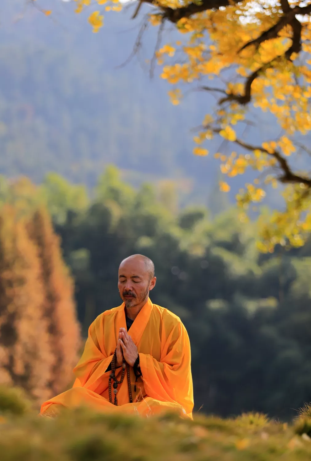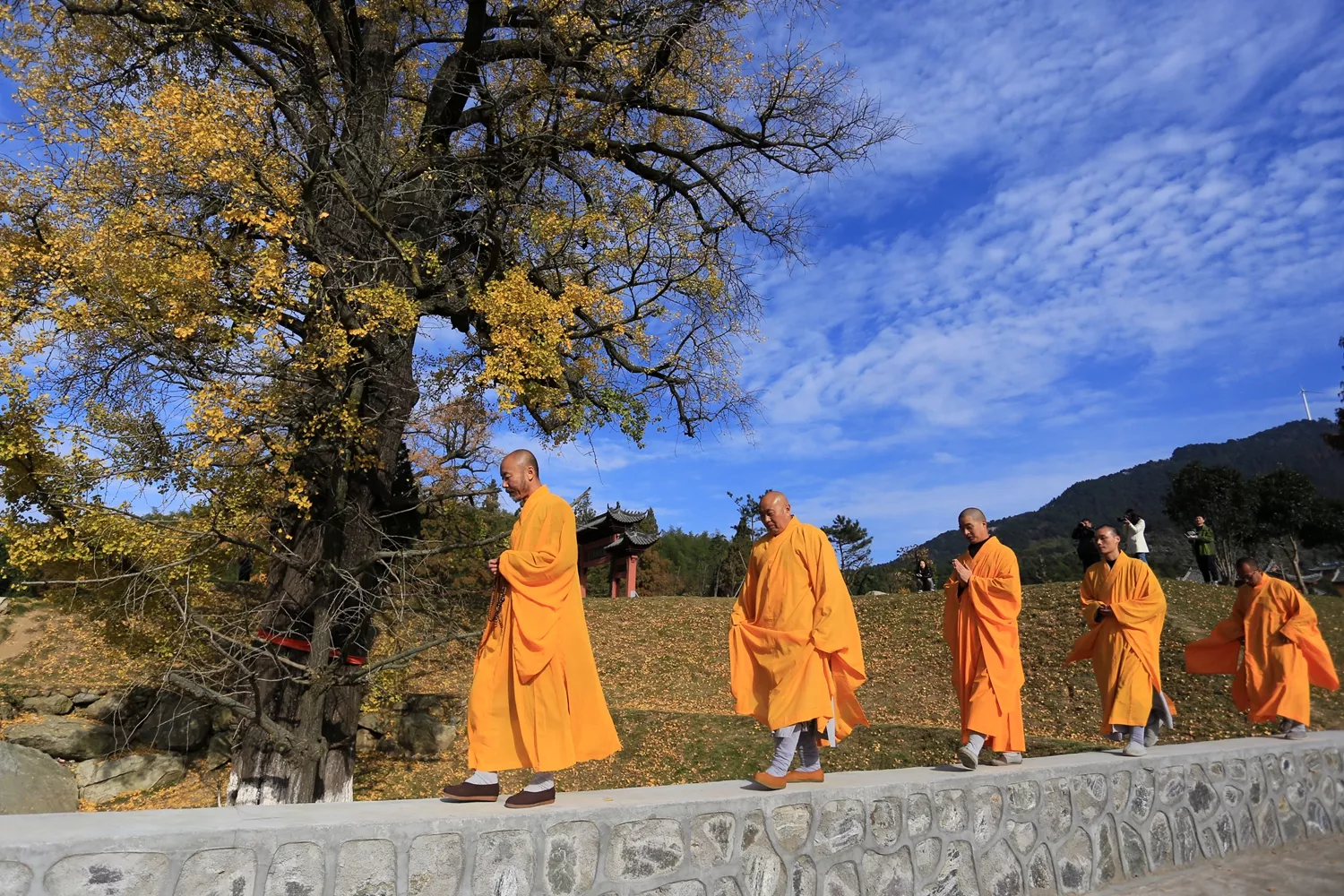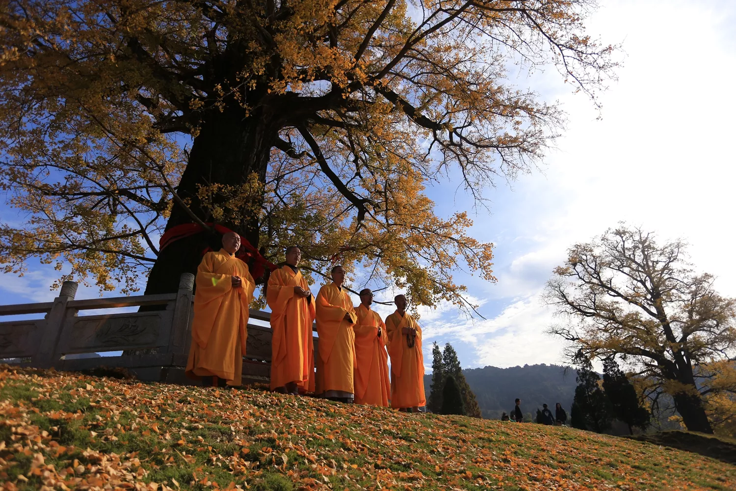 2017年11月5日,河南省商城县黄柏山法眼寺两棵千年银杏满身金黄,五位法师在银杏树下祈福引游人围观。