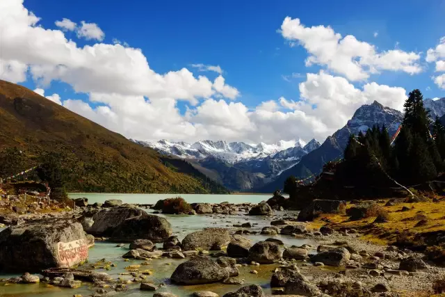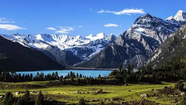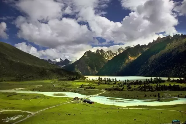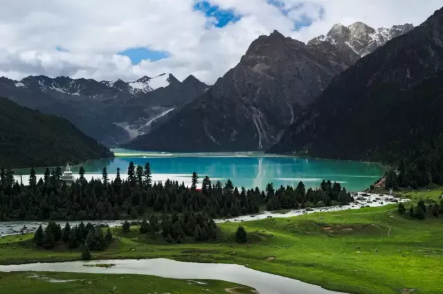 是不是有关不知道,但玉隆拉措的美却是脱俗的。湖泊周围由高原云杉、冷杉、柏树、杜鹃树和草甸环绕,蓝天白云、雪峰皑皑、冰川闪烁、青山融融、绿草茵茵、波光粼粼,可谓世间仙境。