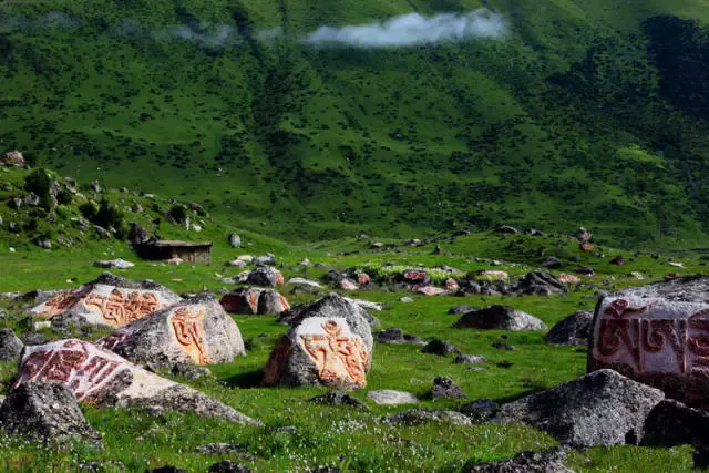 湖边,许多玛尼石屹立在起伏的草地上。虔诚的藏族同胞在石上刻满了庄严的金刚瑜珈母、文殊菩萨、金刚手菩萨、观音菩萨、莲花生大师、金刚萨埵等众多佛像,以及诸佛菩萨的种子字和咒语。