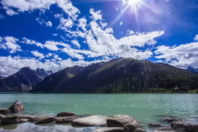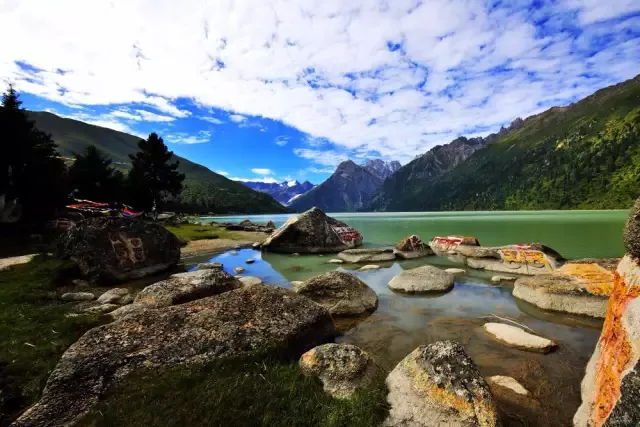 美丽的阳光从诸佛手中轻轻洒落,穿过无暇的流云,轻抚美丽的玉隆拉措,她娇羞的水波涟漪,拍打岸边的玛尼,和着拉加寺尊贵僧人们朗朗的诵经声,让人不知身在何处,吉祥圆满,和乐融融......