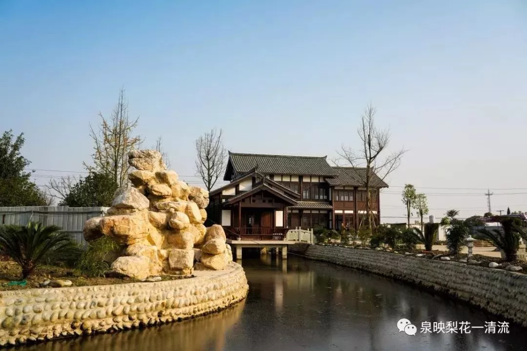 清流文创园里的“梨园雅舍”民宿,推窗即见梨花,白墙青瓦映在水景中,极富中国传统文化韵味。