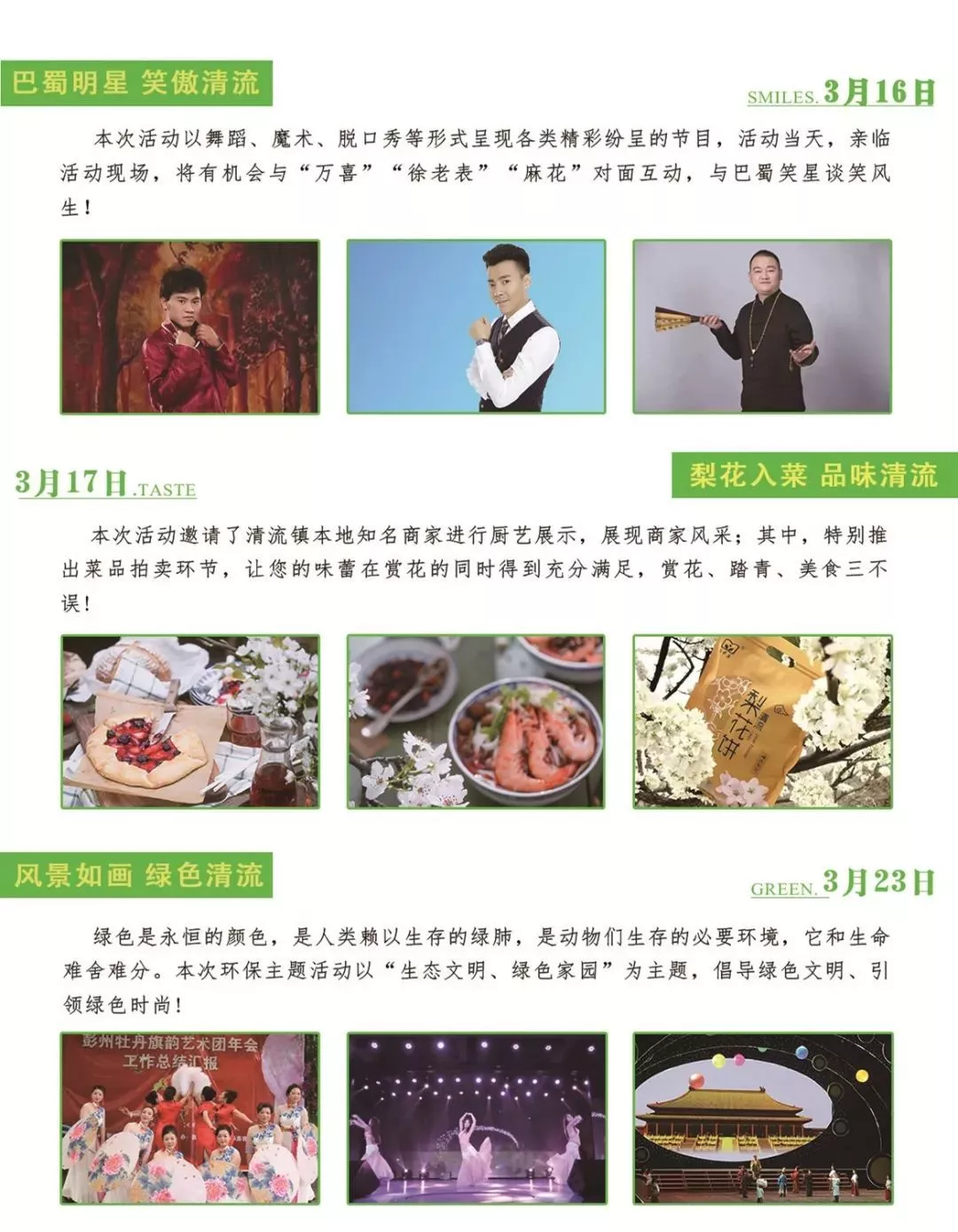 清清泉水绕芳甸,梨花轻语展笑颜。3月12日上午,在文学大师艾芜故里,欢快的歌舞声中,“泉映梨花·自在清流”成都新都清流镇第六届梨花节正式拉开序幕。即日起持续到月底,将推出“乘科技之风 享文化清流”表演活动、“巴蜀笑星 笑傲清流”娱乐主题活动、“风景如画 绿色清流”环保主题活动、“歌声悠悠 音约清流”音乐演出活动、“花海迎宾 共赏清流”少儿演出活动、“梨花入菜 品味清流”美食主题活动、“蜀国大师 沉醉清流”文艺表演活动等8场活动。每个周末,都有不一样的主题,不一样的欢乐。