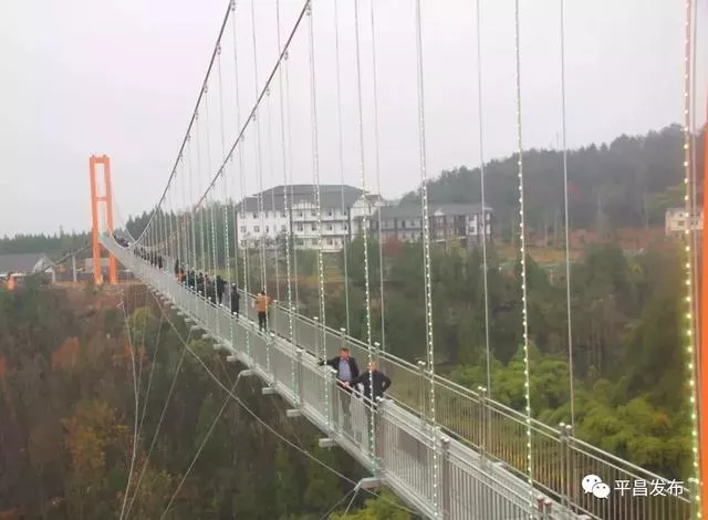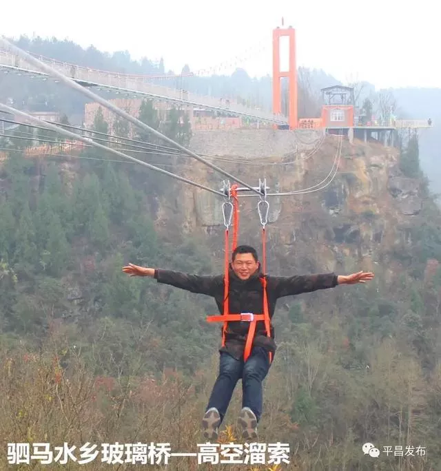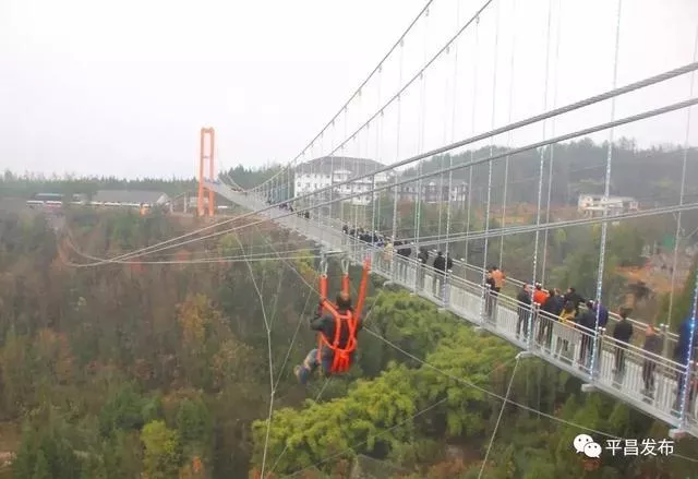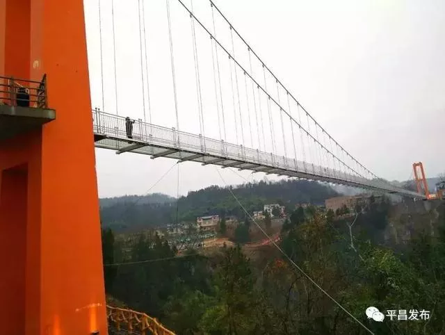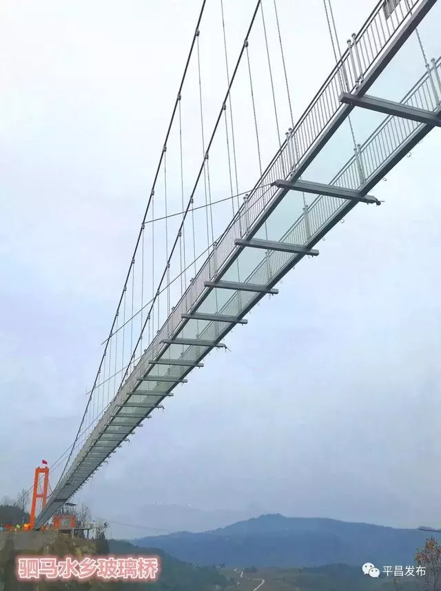 平昌县驷马水乡玻璃桥位于驷马水乡国家AAAA级旅游景区,玻璃桥主跨286米,宽2.2米,高190余米,是川东北首个全透明高空玻璃桥;配套建有高空玻璃桥、七彩滑道、悬崖秋千、高空溜索、系留热气球、丛林穿越、军事乐园等项目。