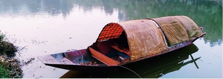 水似绉绸船似鞋,青山一半许沉埋。