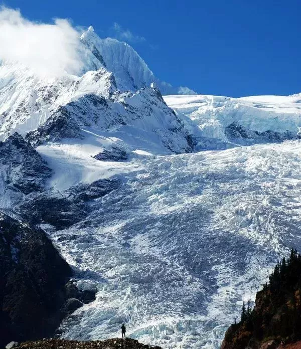 千年寒冰,傲然屹立!远观威严,近观震撼!冰川可以顺山谷流下来,只是流动的速度很慢,最前面的冰舌在夏天温度高的时候可以到达零度以上的山麓地带。远远看去冰川上雾气弥漫,升腾出来,形成奇幻之观!